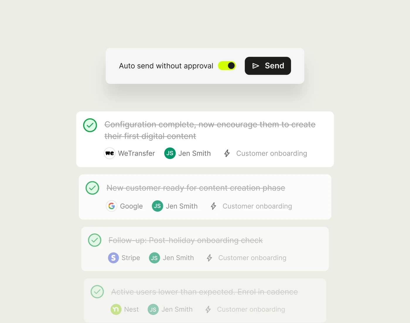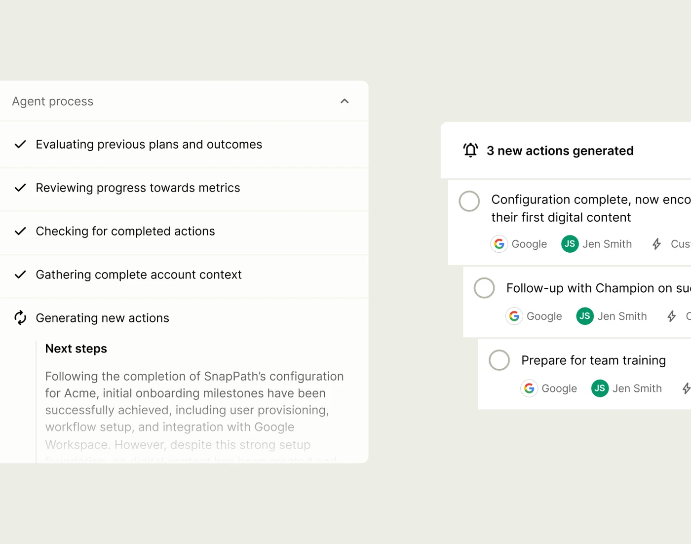 Set the onboarding milestones you want each customer to reach, and by when, whether that’s first value or adoption of key features. Activator takes in the full context of every customer, from how they’re using the product today to what they’ve shared in emails, calls, and support conversations. It understands why they bought, what they care about, and what they’ve already adopted, then builds the best possible plan to move them toward their goals.